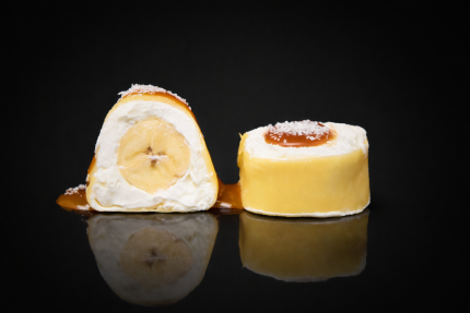 Нежнейший сливочный ролл в блинчике с бананом и карамельным топингом с кокосовой стружкой.