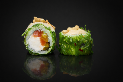 Диапазон цен: 9,90 BYN – 18,00 BYNРис, нори, сыр сливочный, лосось, перец болгарский, водоросли хияши, орехово-кунжутный соус, кунжут, кешью.