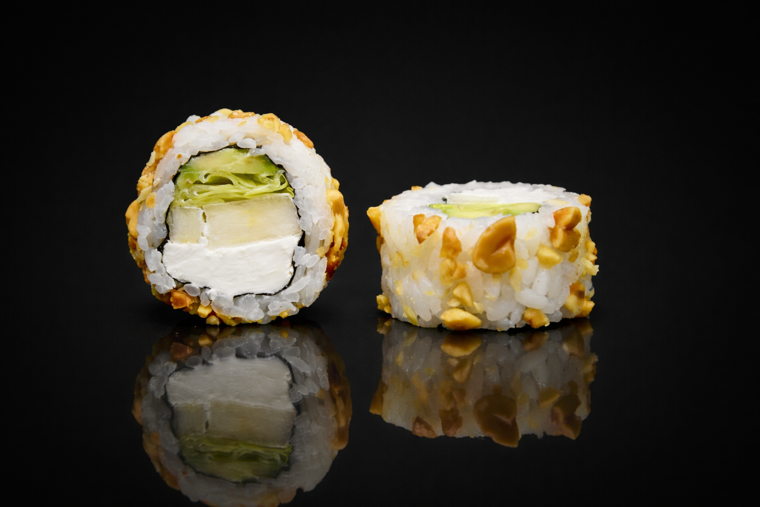 Рис, нори, сыр сливочный, груша, авокадо ,салат микс, арахис.