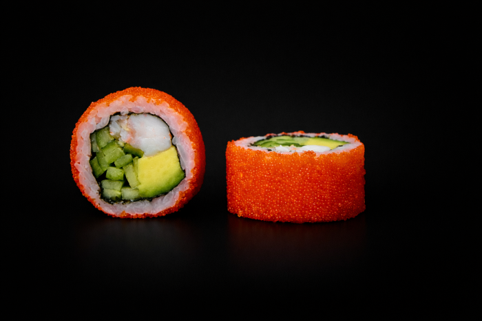Рис, нори, креветка, огурец, икра тобико, авокадо.