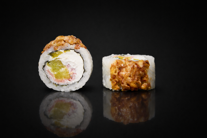 Рис, нори, сыр сливочный, перец болгарский, бекон, кранч лук, редис маринованный, орехово-кунжутный соус.