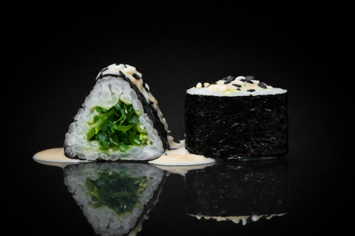 Рис, нори, водоросли хияши, соус кунжутно-ореховый, кунжут