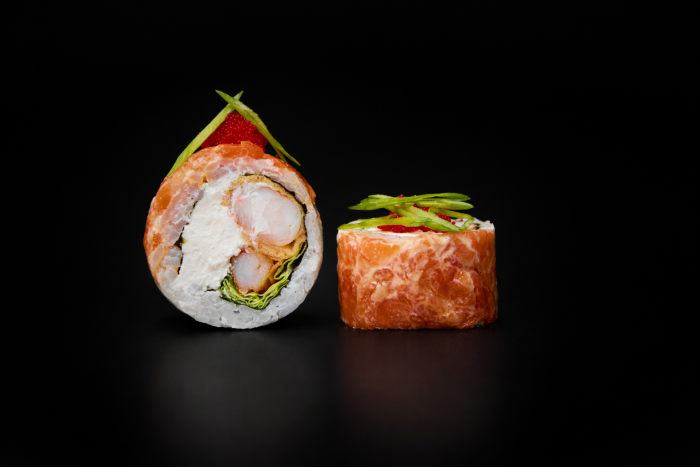 Рис, нори, сыр сливочный, креветка темпура, салат микс, лосось, соус спайси, икра тобико, зеленый лук.