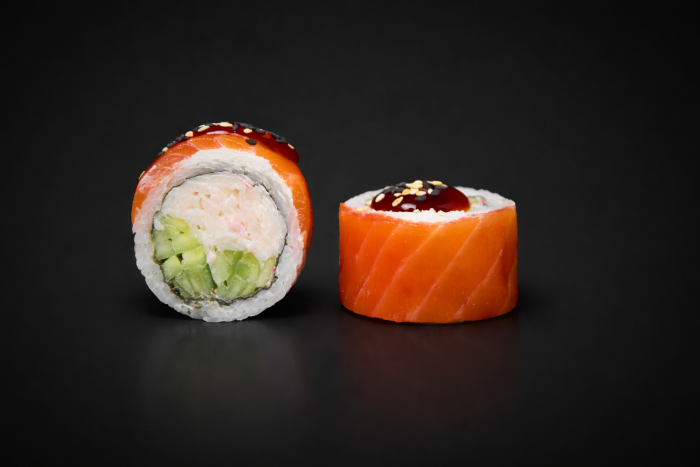 Рис, нори, сыр сливочный, огурец, краб ( имитация), лосось, соус терияки, кунжут.