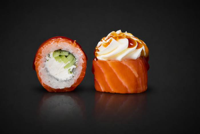 Рис, нори, сыр сливочный, лосось, огурец, соус терияки.