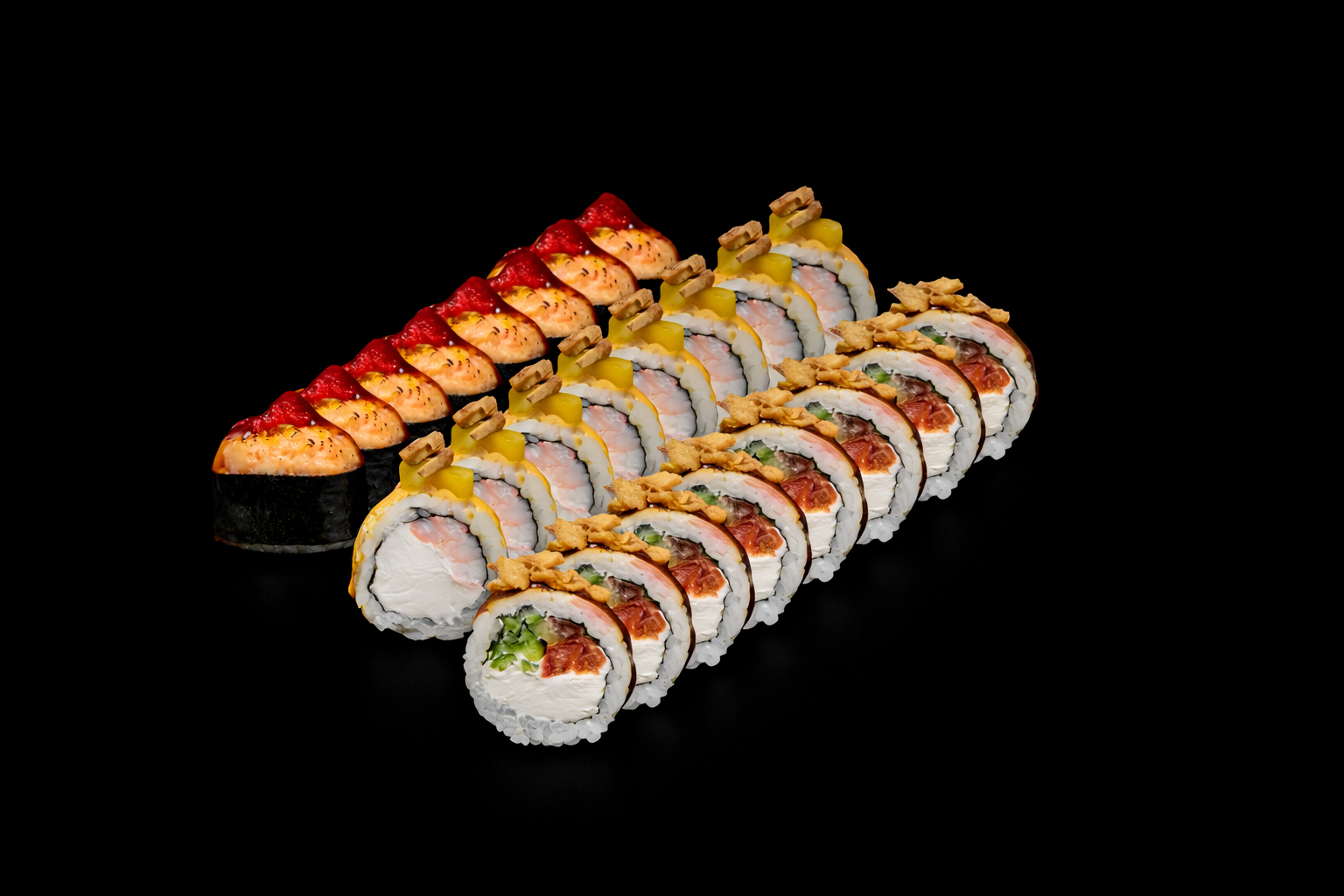Запеченный ролл с лососем, Креветка манго, Жареный бекон с кранч луком