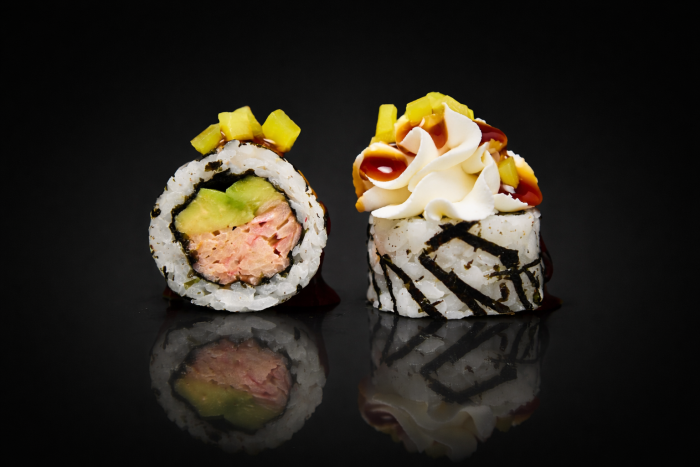 Рис, нори, сыр сливочный, краб(имитация), авокадо, спайси соус, соус терияки, редис маринованный, перец кайенский.