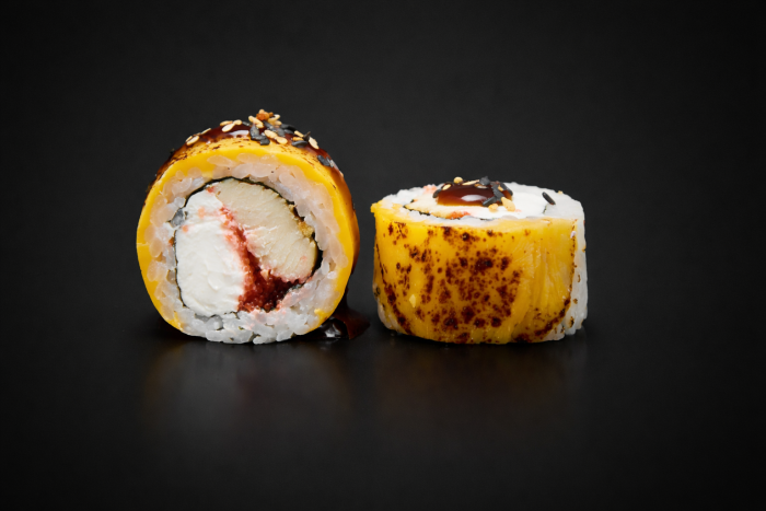 Рис, нори, сыр сливочный, икра тобико, цыпленок терияки, сыр чеддер, кунжут.