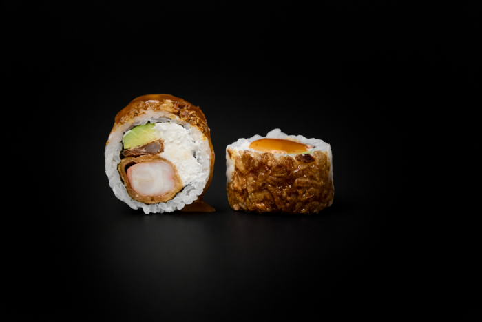Рис, нори, сыр сливочный, креветка темпура, авокадо, кранч лук, соус тайский манго-чили
