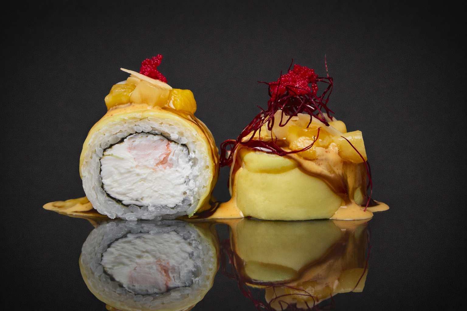 Рис, нори, сыр сливочный, креветка, авокадо, соус спайси-манго, соус терияки, манго, лепестки миндаля, нити чили, икра тобико.