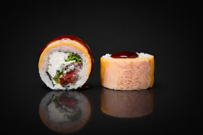 Рис, нори, сыр сливочный, томат, салат микс, сыр чеддер, бекон, соус терияки, кунжут.