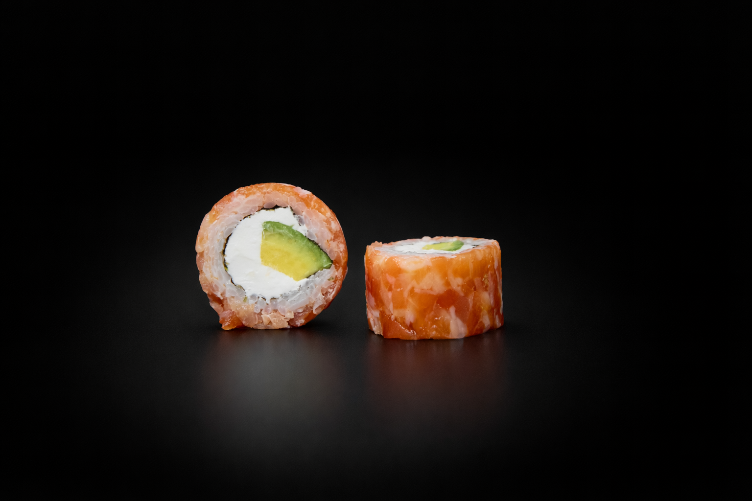 Рис, нори, сыр сливочный, тунец, лосось, креветка, авокадо.