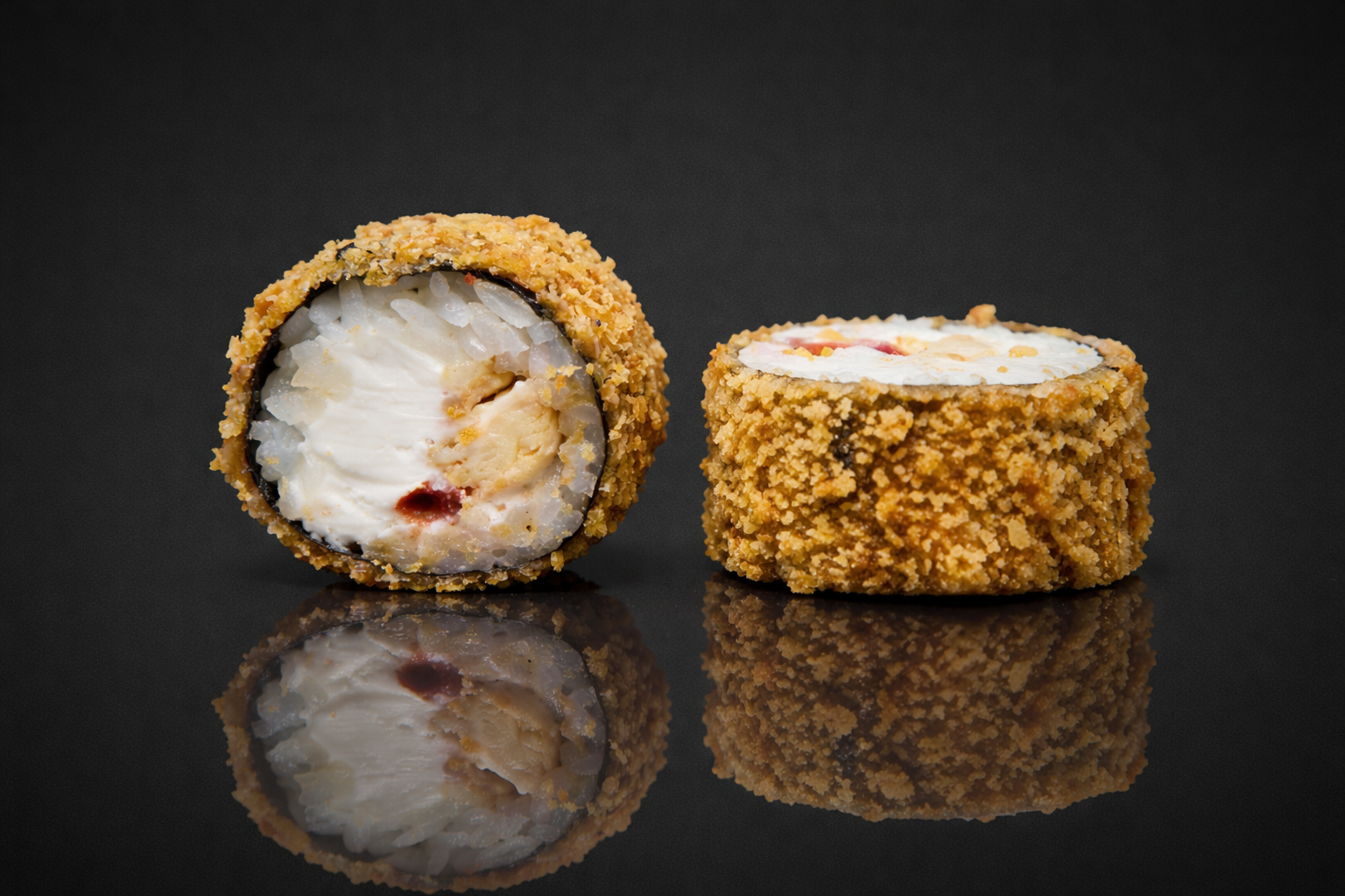Рис, нори, сыр сливочный, цыпленок терияки, томат, темпура, панировочные сухари.