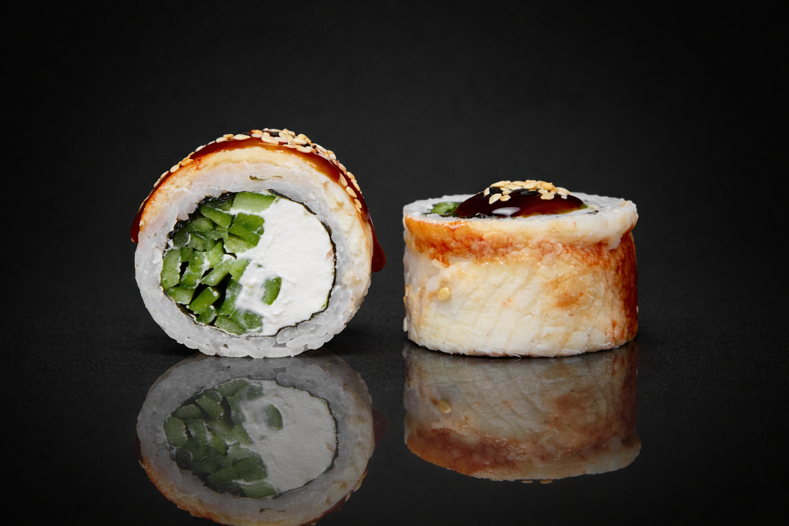 Рис, нори, сыр сливочный, угорь, огурец, соус унаги, кунжут.